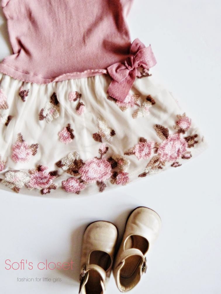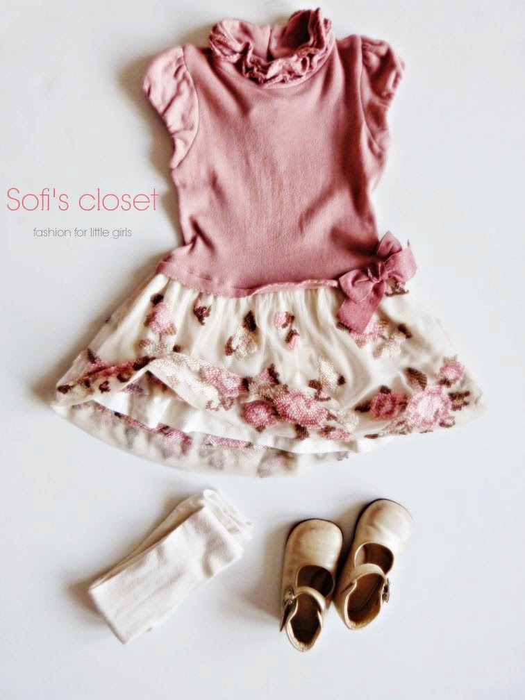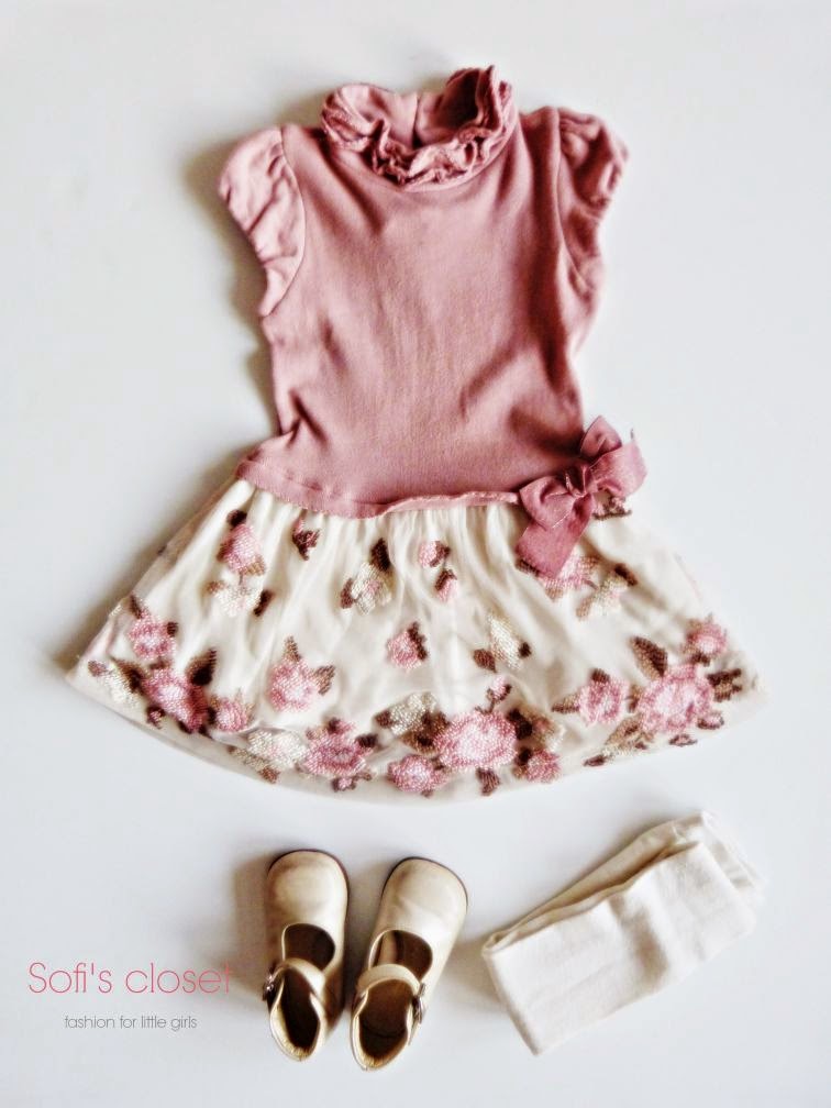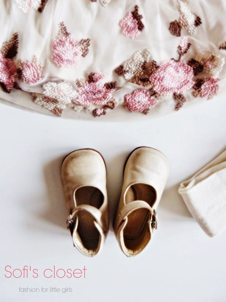Un regalino di Babbo Natale che abbiamo già sfoggiato per un’occasione speciale come il compleanno di papà. Assieme ad un lupetto panna, perchè fa ancora freddo, ad una calzamaglia panna e a delle ballerine color champagne.