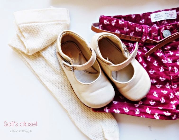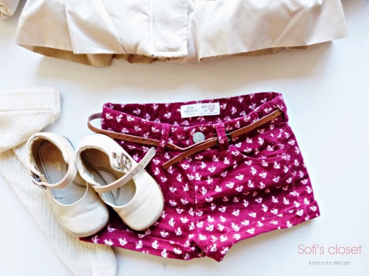 Qui lo abbiamo abbinato ad uno short color lampone in microvelluto, a dei collant color panna e alle ballerine da bambolina. Ancora un berrettino caldo con fiocco applicato e voilà, siamo pronte!