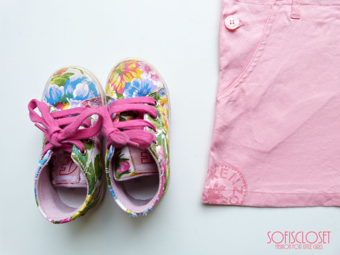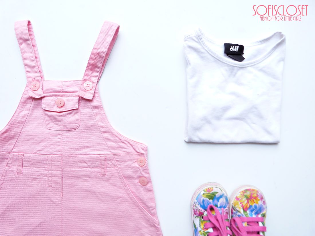 Basta la salopette. E poi una sempliccissima tshirt bianca e delle sneakers. Anche bianche. Oggi però io ho scelto con Pippi di abbinarla alle nostre sneakers con i fiori.