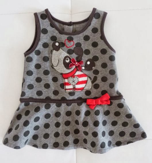 Il look di oggi vede questo vestitino grigio a pois. E’ bellissimo, con il cagnolino e il fiocchetto rosso in vita.